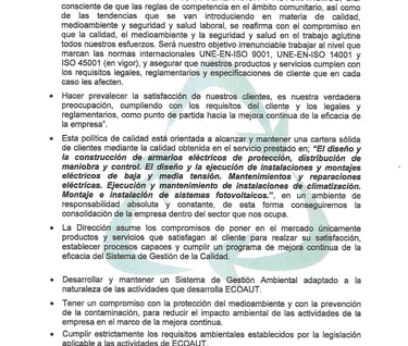Nuestra política de calidad se basa en los principios de satisfacción del cliente, mejora continua y cumplimiento de normativas. Nos esforzamos por ofrecer servicios eléctricos que no solo cumplen con los estándares de la industria, sino que también superan las expectativas de nuestros clientes.