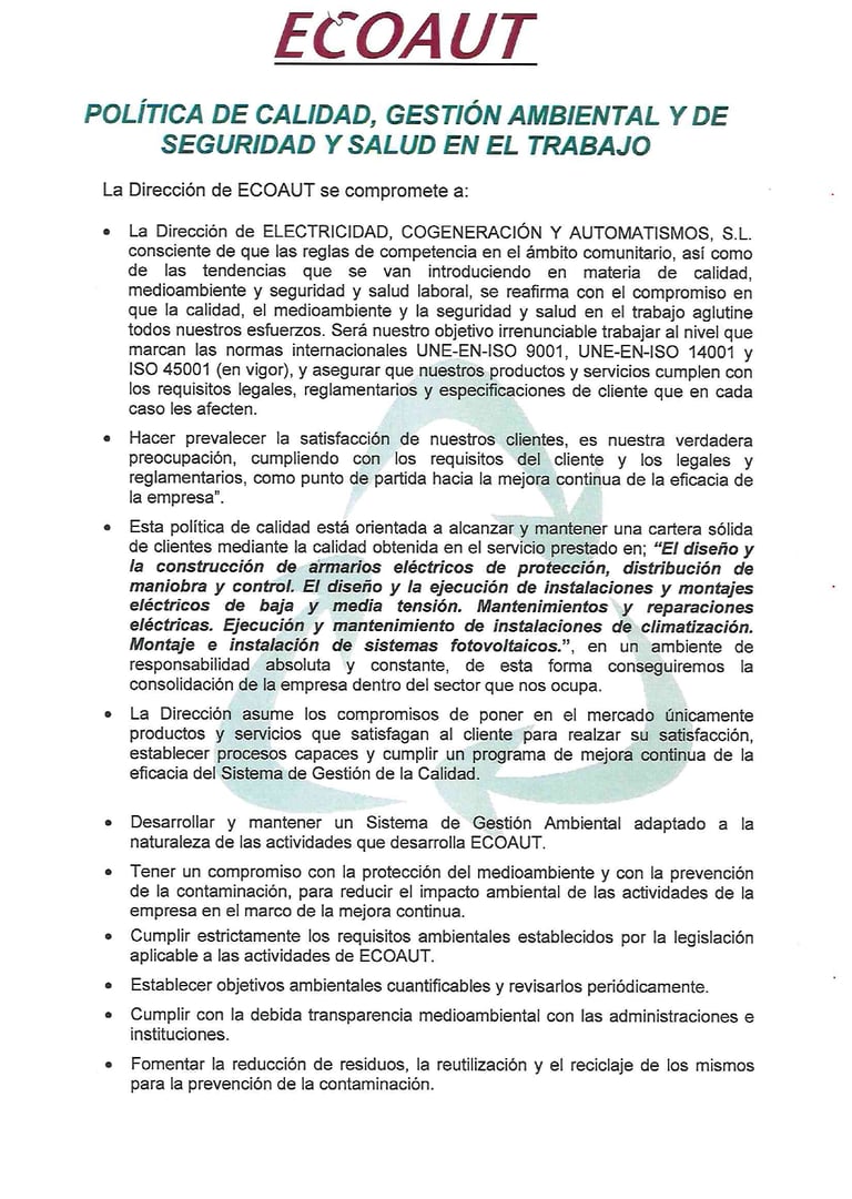 En Ecoaut, nos comprometemos a proporcionar soluciones de energía solar que cumplen y superan las expectativas de nuestros clientes. Nuestra política de calidad se basa en los principios de mejora continua, innovación, y satisfacción del cliente. Nos esforzamos por mantener los más altos estándares en todos nuestros procesos y productos.
