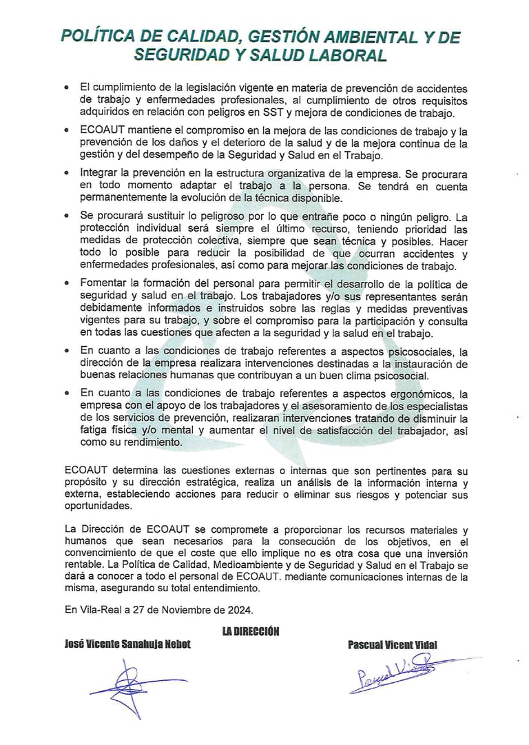 Politica de Calidad, Gestión Ambiental, Seguridad y Salud